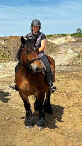 Sissi de Bruyeres („Elfi“) ist eine 2011 geborene Ardennerstute, 1,48 m groß. Sie ist sehr kräftig, fleißig, und für den Anfängerunterricht zu sensibel, deswegen suchen wir für sie einen erfahrenen Reiter, beispielsweise aus dem Wanderreitsport. Elfie ist geländesicher, schmiede- und verladefromm.